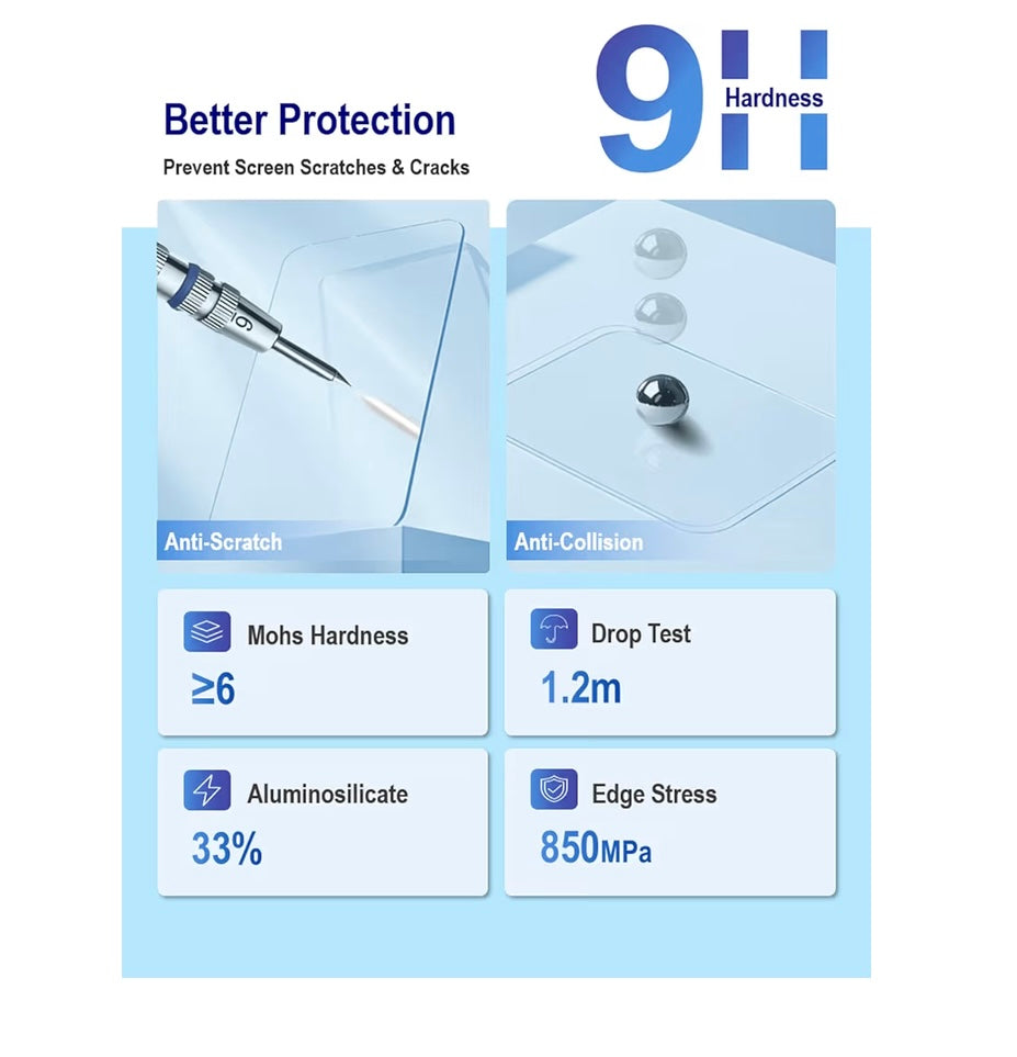 - Dureza 9H: el protector de pantalla de vidrio templado de dureza 9H ofrece una resistencia fiable a los arañazos y a los golpes para proteger tu pantalla.