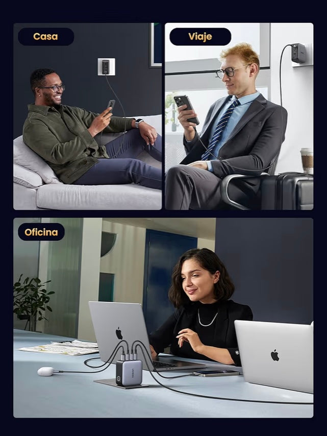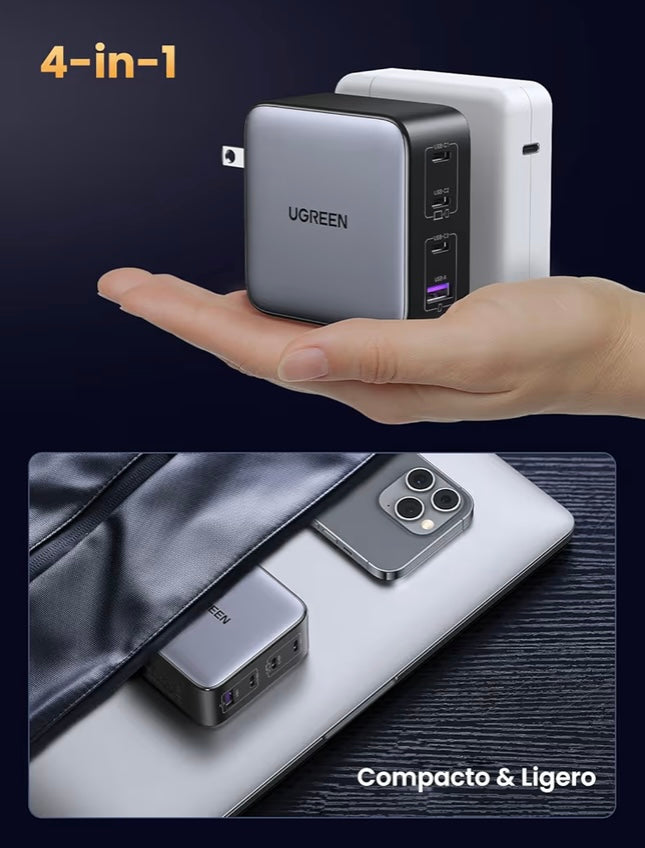 - Cargador GaN con 4 Puertos: UGREEN Nexode 100W cargador USB C con 4 puertos( 3 puertos USB C y 1 puerto USB A) admite una salida total de hasta 100W, es compatible con casi todos los dispositivos, desde portátiles USB C hasta móvil, switch y otros dispositivos. Nota: El puerto USB C3 y el puerto USB A no se pueden usar al mismo tiempo